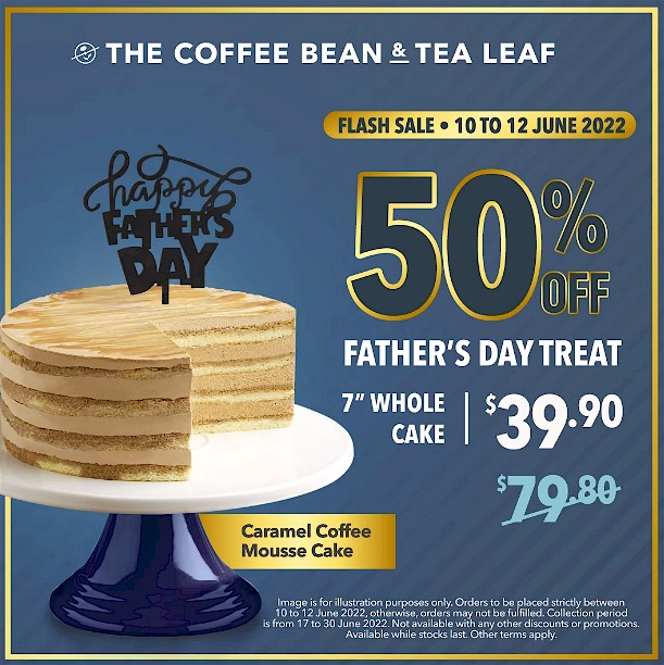 For this Father's Day, The Coffee Bean & Tea Leaf is having a flash sale on 7" Caramel Coffee Mousse Cake at 50% off for $39.90 (U.P. $79.80) from 10 to 12 June 2022. Collection period will be from 17 to 30 June 2022.