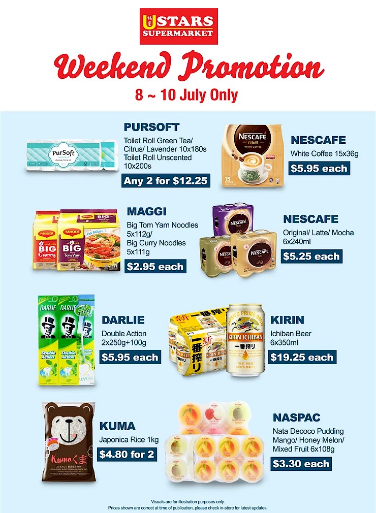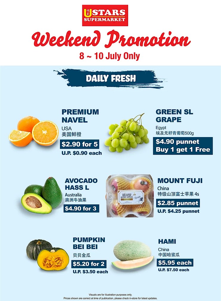 Check out U Stars Supermarket latest Weekend Promotion from 8 - 10 July 2022. Fresh items are available at all U Stars Supermarkets except the followings: 153 Serangoon North Avenue 1 #01-486 S550153 | 144 Teck Whye Lane #01-203 S680144 | 18 Toh Yi Drive #01-11 S590018 | 201A Tampines St 21 #01-1059 S521201.