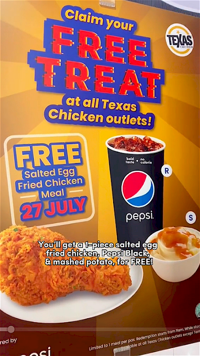 Enjoy a free Salted Egg Fried Chicken Meal at Texas Chicken on 27 July 2023. Each meal comprises of 1 Salted Egg Fried Chicken part, 1 Pepsi Black (R) and a small mashed potato. Limited to 1 redemption per customer. Only 3000 sets are available so head down to your nearest Texas Chicken outlet ASAP while stocks last. However take note that this promotion not available at Century Square and Terminal 4 outlet.