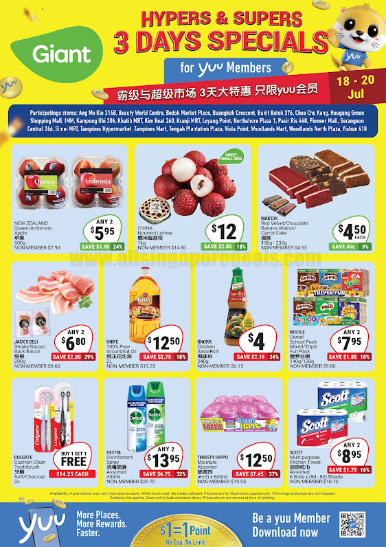 Offers are valid at these participating Giant outlets: Tampines Hypermarket, IMM, Pioneer Mall, Ang Mo Kio 316B, Beauty World Centre, Bedok Market Place, Buangkok Crescent, Bukit Batok 376, Choa Chu Kang, Hougang Green Shopping Mall, Kampong Ubi 306, Khatib MRT, Kim Keat 260, Kranji MRT, Loyang Point, Northshore Plaza 1, Pasir Ris 440, Serangoon Central 266, Simei MRT, Tampines Mart, Tengah Plantation Plaza, Vista Point, Woodlands Mart, Woodlands North Plaza, Yishun 418.